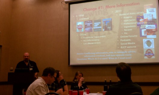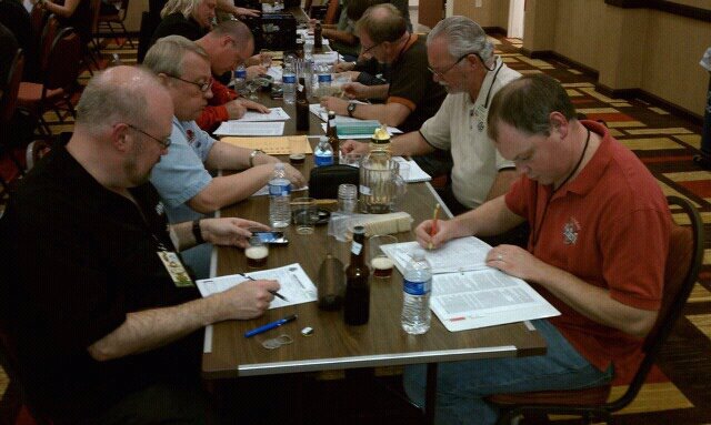 Friday typically has a judging session in the early afternoon for BJCP judges who want to get the most points for the weekend. Later there is a catered dinner with a great guest speaker, this year it was BJCP President Gordon Strong speaking on “Brewing Better Beer” (previous 3 years guests 2008-Jamil Zanisheff, 2009-John Palmer, 2010-Dave Miller). This year everyone who bought a ticket to the dinner also got MCBO snifter. I brewed the commemorative beer for this year so they also got their choice of a 750ml bottle of Traditional Belgian Dubbel or (and I know this won’t shock anyone) the same recipe, but funked…A majority of people chose the soured version. I was happy to see people embracing the funk! Post dinner is a relaxing evening hanging out with other brewers and having a few beers. I was happy to see all the people who would be judging kept their pallets in check that night for the next morning.