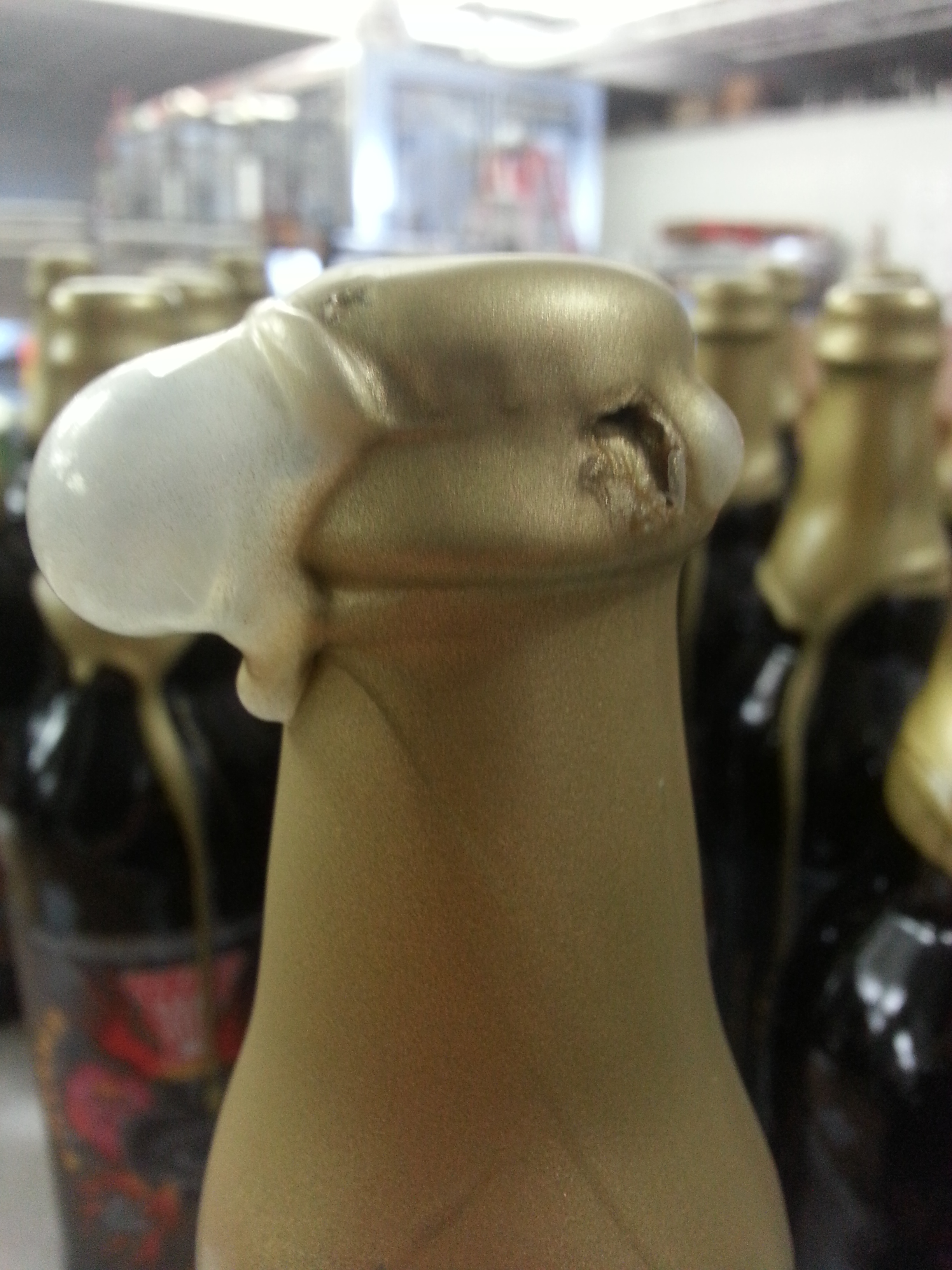 There many different ways to dip and create certain effects on the bottles with no drips, single drip, multiple drips, short drip etc. But they all begin with the first dip which in our case using this setup is very quick. No more than the minimum time needed to dip the neck in and out, about 1 second. So what’s the reason? If the bottle is in the fryer with the wax too long it will melt the seal under the cap and compromise the seal. If it does you will know it, the escaping co2 will bubble out the wax. I’ve been fairly lucky so far, only screwing up one bottle by dipping too long. See the pic to the left side. So once you’ve dipped and quickly removed the bottle from the fryer it’s time to create the wax effect. Holding it over the fryer and letting it drip back in will make clean edge all the way around. Setting it down as soon as you let a little drip back in with produce multiple drips. The one I went with on this batch was a single long drip. Which is fairly easy to do. Let a little wax drip back in (which allows part of it cool on the bottle) then hold the bottle upright, but at a slight angle, the wax should pull to one point and drip. Where I usually wax our bottles is near a drain, which has a slight slope. I can set the bottles down on the table and the wax will continue to drip.