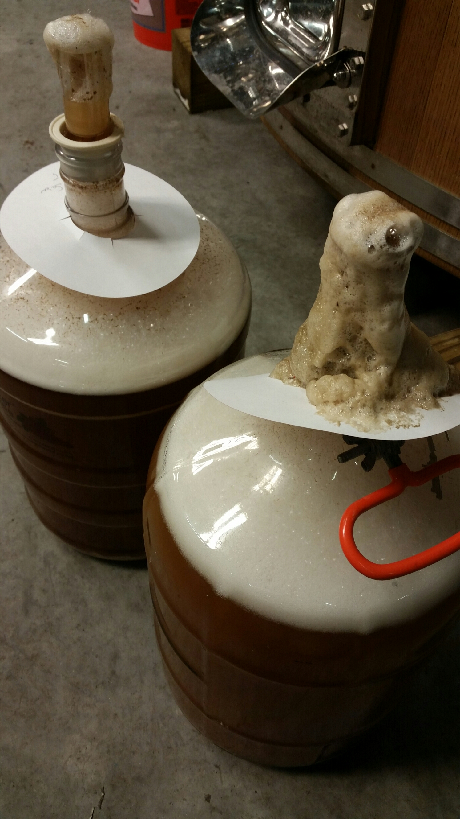 I pitched at 65F and it self rose to 71F in 2 days while foaming out of the airlocks. The ambient temp is 66F so fermenting in day 5 has slowed down, but continues to bubble the airlock 1 or 2 times a second. OG was 1.053 and it currently sits at 1.022. This beer is very very young but the aromas of citrus, bubblegum and clove remind me of my beloved strain from Blaugies. It’s still too young to detect and Brettanomyces, but I’ve been told this particular one shows up fairly young.